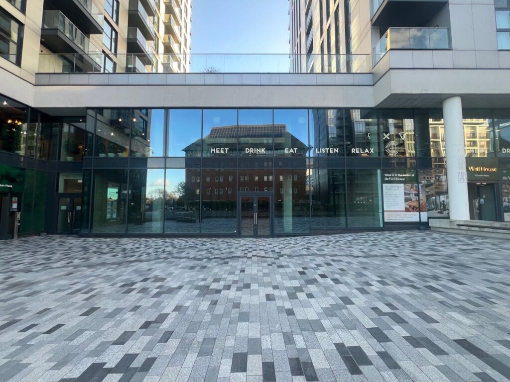 Ground floor retail unit with modern, glazed double-height frontage. The unit is suitable for a variety of commercial uses including retail, leisure, medical, health & beauty & wellness uses.
